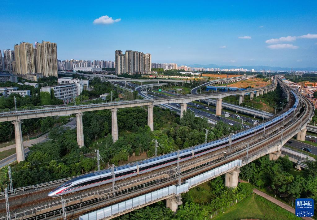 2022年6月24日,復興號動(dòng)車(chē)組行駛在成渝城際鐵路上(無(wú)人機照片)。新華社記者 王曦 攝