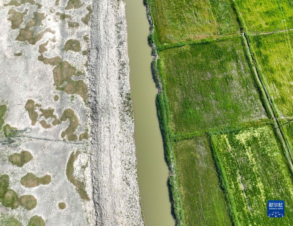 這是2022年7月12日拍攝的吉林省白城市鎮賚縣的稻田(右)與鹽堿灘涂(無(wú)人機照片)。新華社發(fā)(潘晟昱 攝)