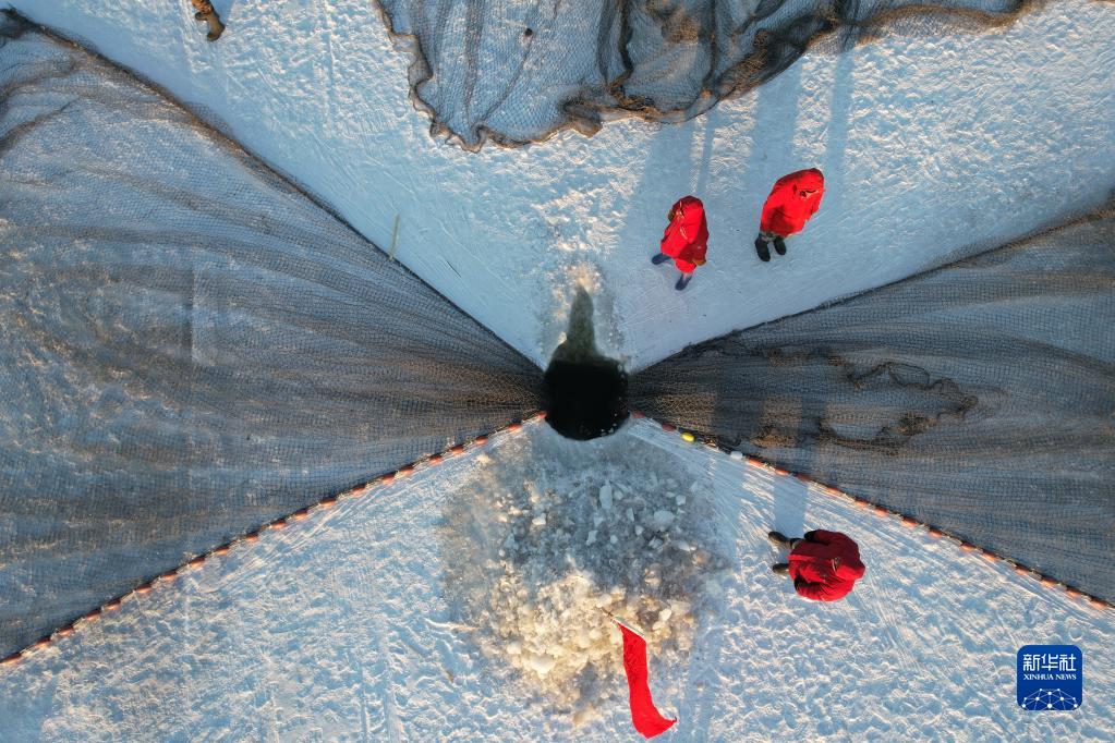 吉林省白城市鎮賚縣的哈爾淖冬捕(無(wú)人機照片,2021年12月25日攝)。新華社發(fā)(潘晟昱 攝)