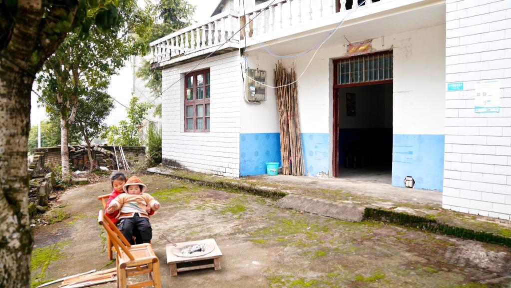 2022年12月31日,鄒若馨(左)在位于江西省九江市武寧縣的家中院內陪弟弟玩耍。 新華社記者 胡晨歡攝