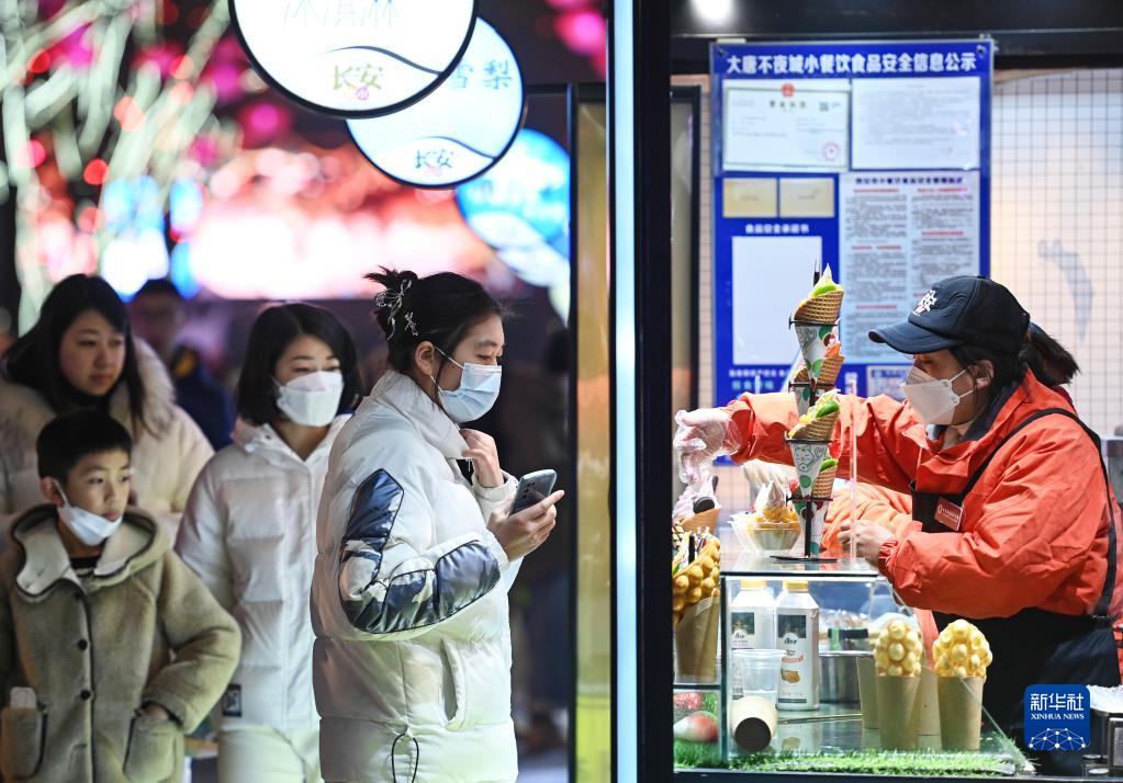 2022年12月30日,游客在陜西西安大唐不夜城步行街選購小吃。新華社發(fā)(鄒競一 攝)