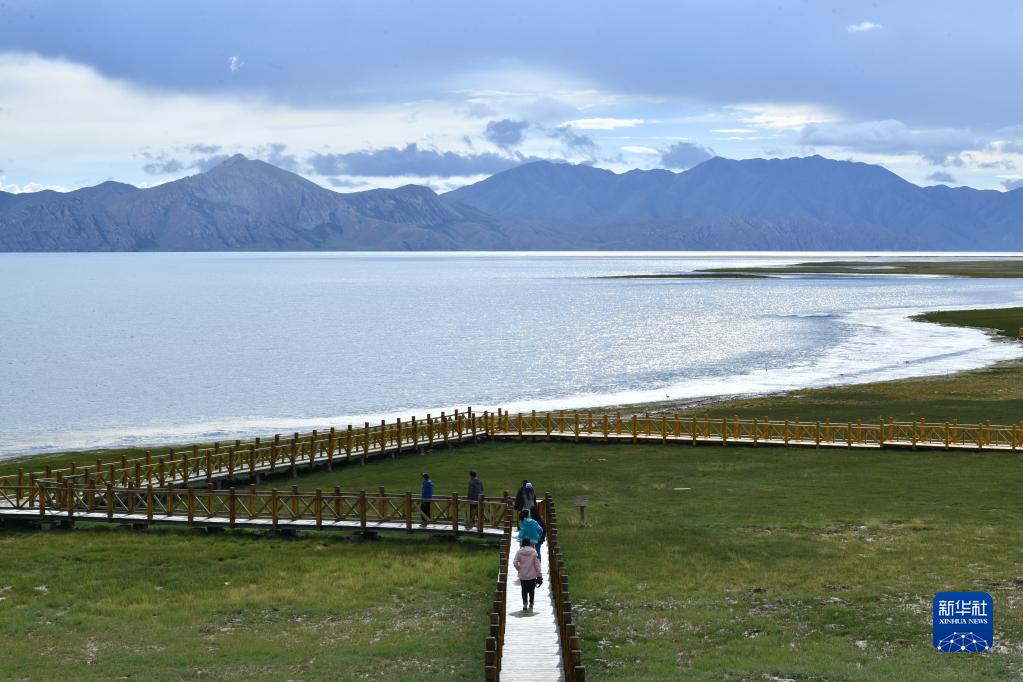 游客行走在青海省果洛藏族自治州瑪多縣冬格措納湖岸畔的木棧道上(2022年8月14日)。新華社發(fā)(卡婭梅朵 攝)