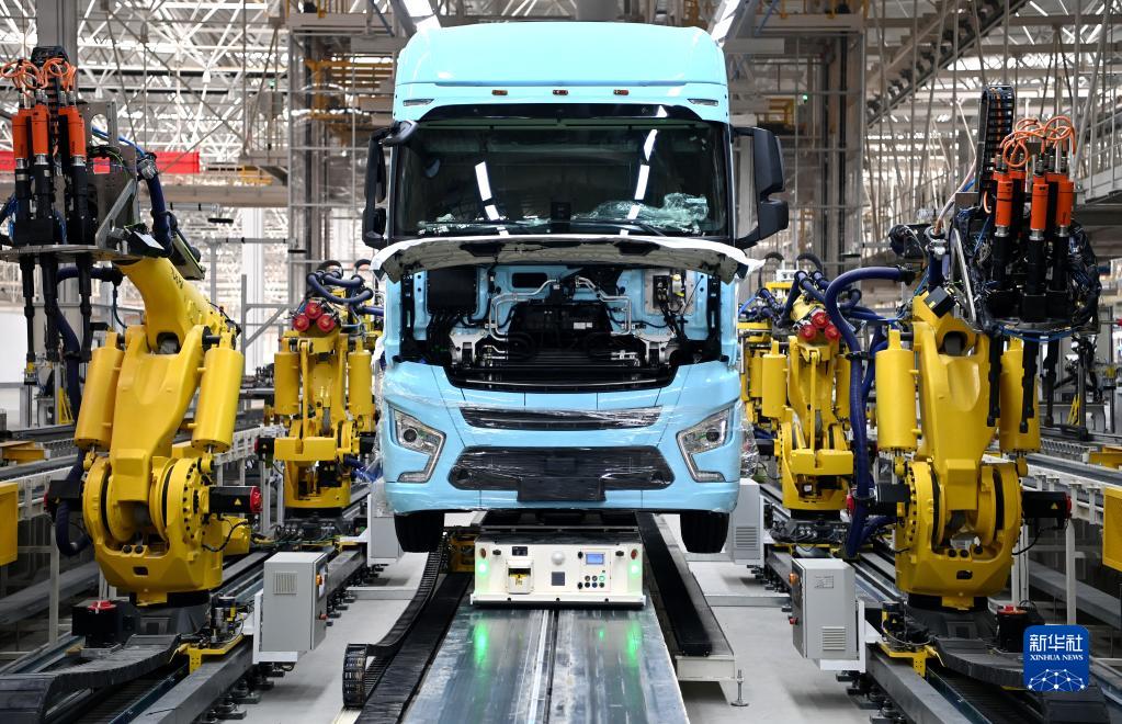 在陜汽重卡擴能項目現場(chǎng),一輛重卡在汽車(chē)總裝生產(chǎn)線(xiàn)輪胎自動(dòng)化裝配擰緊無(wú)人工作站進(jìn)行裝配(2022年9月27日攝)。新華社記者 劉瀟 攝