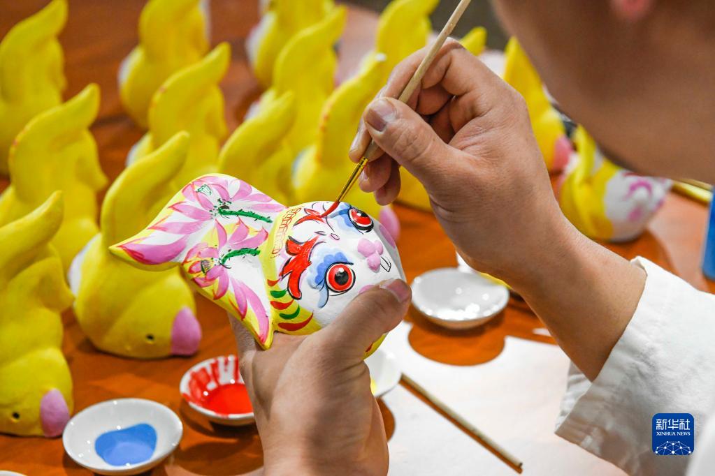 1月16日,河北省玉田縣一家泥塑工坊的民間藝人在給生肖兔作品著(zhù)色。新華社發(fā)(劉滿(mǎn)倉攝)