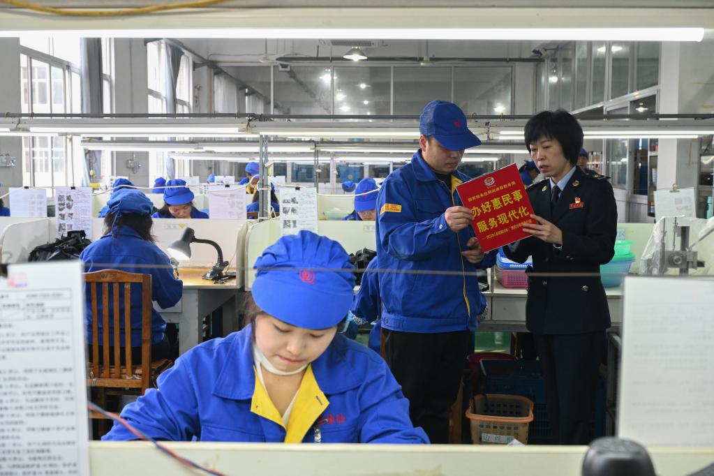 在福州榮清橡膠有限公司生產(chǎn)車(chē)間,國家稅務(wù)總局閩清縣稅務(wù)局工作人員向企業(yè)負責人介紹稅惠政策。新華社記者 周義 攝