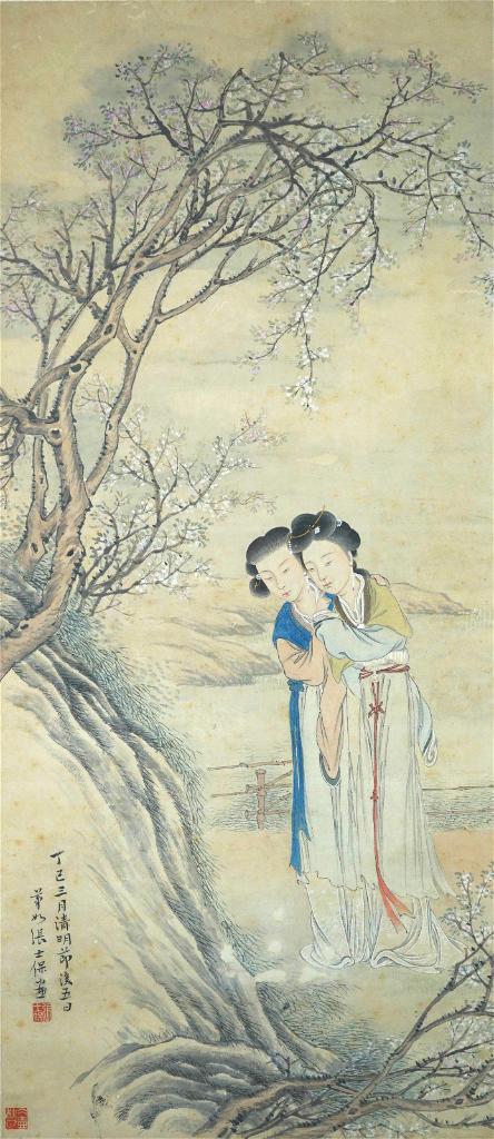 在北京藝術(shù)博物館,一幅長(cháng)1米多、寬40多厘米的清代設色紙本,生動(dòng)地描繪了古人清明踏青時(shí)的活動(dòng)。畫(huà)面中梨花吐蕊,踏青賞春的兩位女子在岸邊土坡旁流連忘返。其中一人流珠柳簪斜插在發(fā)髻間,另一人則右耳邊插朵花柳簪。畫(huà)左下側落款:丁巳三月清明節后五日。