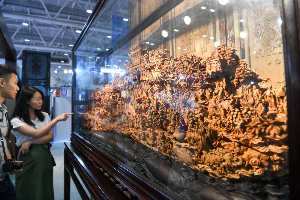 6月8日,觀(guān)眾在文博會(huì )上欣賞莆田木雕作品。新華社記者 梁旭 攝