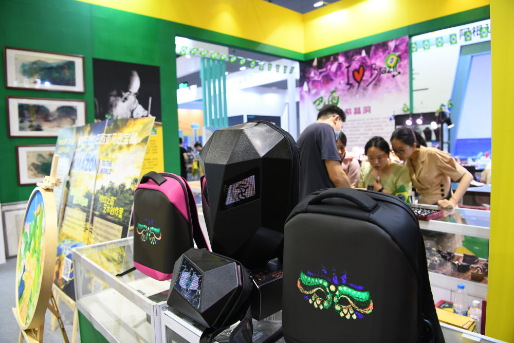 6月8日,文博會(huì )巴西展位上展出的背包,這個(gè)配有LED屏的“雙眼”、名為“鋼鐵俠”的背包產(chǎn)自深圳,在南美銷(xiāo)售火爆。新華社記者 梁旭 攝