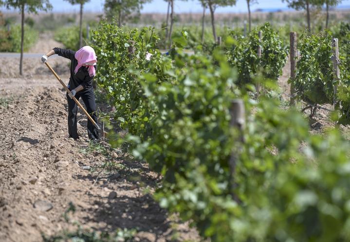6月7日,在位于賀蘭山東麓的西鴿酒莊,一名工人在釀酒葡萄種植基地勞作。新華社記者 馮開(kāi)華 攝