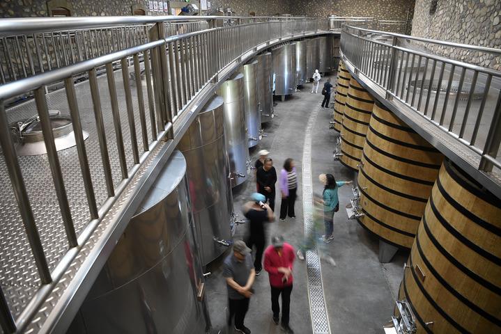 6月8日,在位于賀蘭山東麓的志輝源石酒莊,游客在釀酒車(chē)間參觀(guān)游覽。新華社記者 王鵬 攝