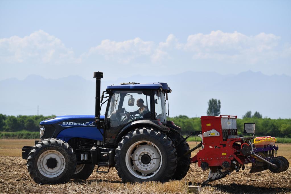 楊轉義駕駛農機在田間播種。新華社記者 張博文 攝