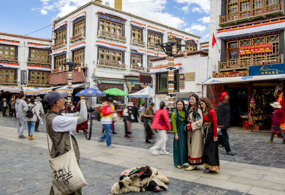 游客身著(zhù)藏裝在拉薩八廓街拍照留念(6月13日攝)。新華社記者 姜帆 攝