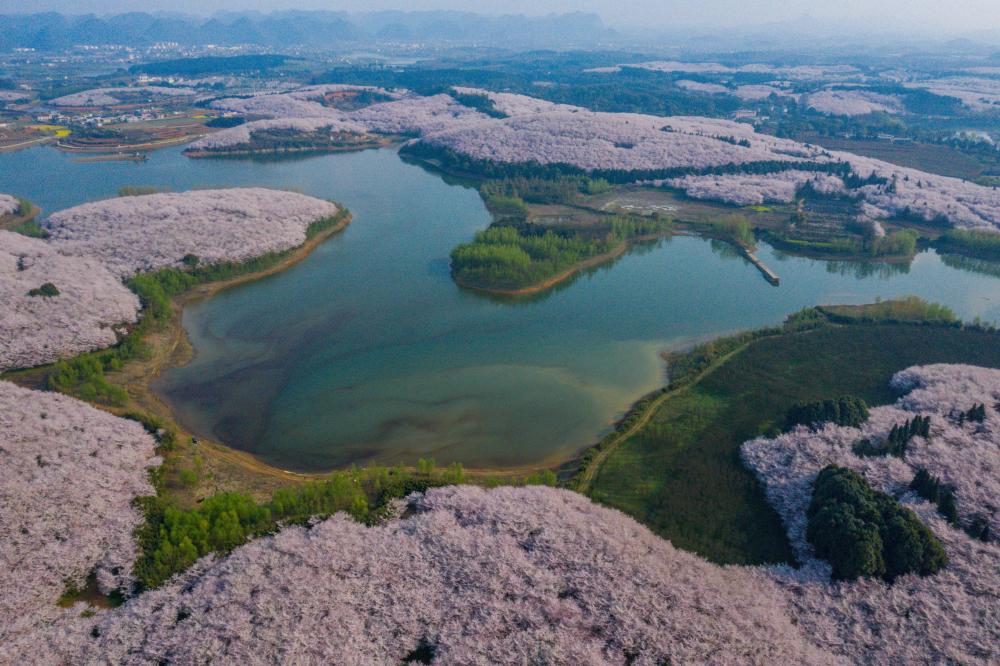 這是2021年3月15日在貴州省貴安新區紅楓湖畔拍攝的櫻花觀(guān)光園(無(wú)人機照片)。新華社記者 歐東衢 攝