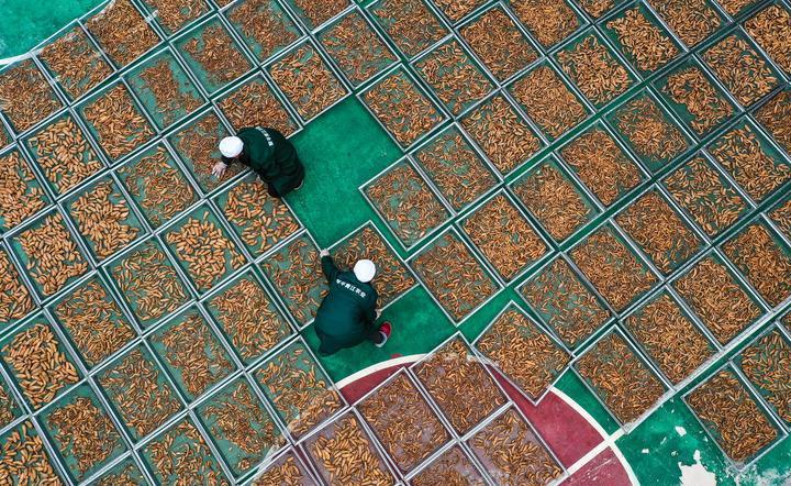 工人在貴州省黎平青江農業(yè)開(kāi)發(fā)有限公司晾曬天麻(2022年12月22日攝,無(wú)人機照片)。新華社記者 楊文斌 攝