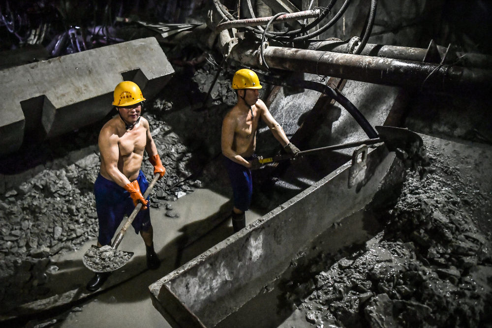 中鐵隧道局的工人在掘進(jìn)機底部清理渣石(2020年11月18日攝)。新華社記者 劉瀟 攝
