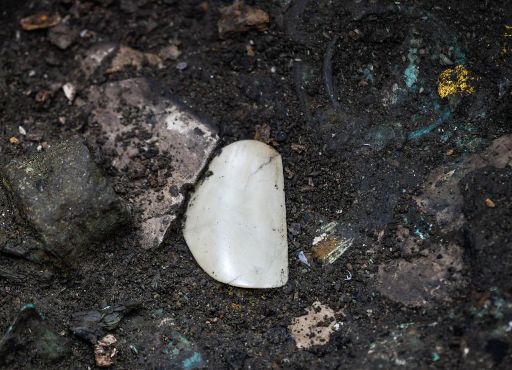 2021年9月2日拍攝于四川德陽(yáng)廣漢市三星堆考古發(fā)掘現場(chǎng)7號“祭祀坑”的玉器。新華社記者 王曦 攝