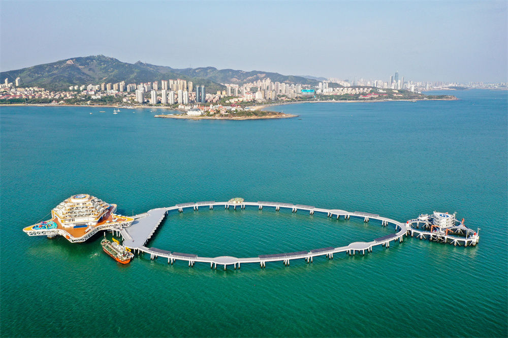 從高處俯瞰四十里灣,“耕海1號”一期和二期平臺在水中遙相輝映,以棧橋圍欄相連,似一條璀璨奪目的寶石項鏈漂浮在海面。