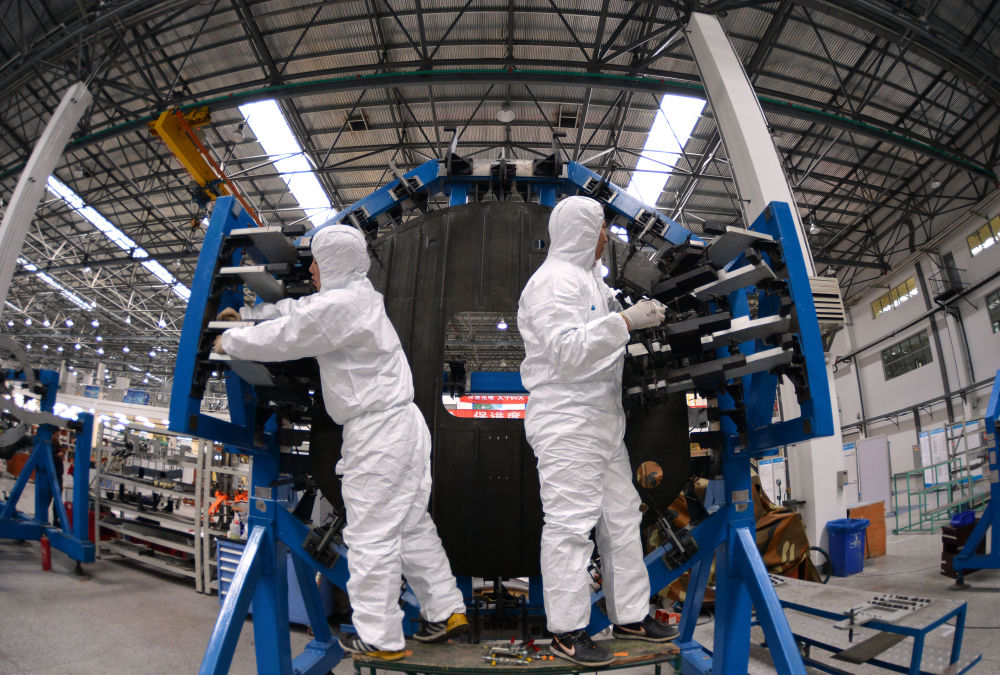 工程人員在位于沈陽(yáng)的中航沈飛民用飛機有限責任公司廠(chǎng)區內進(jìn)行C919后機身后段79框的施工(2014年10月30日攝)。新華社記者 姚劍鋒 攝