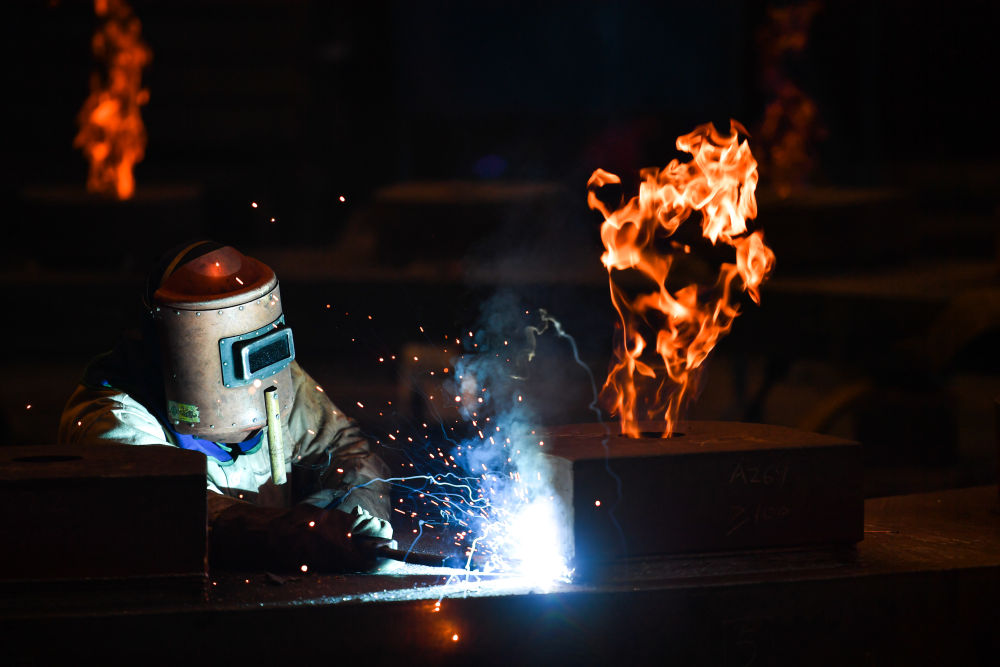 工人在位于黑龍江省齊齊哈爾市的中國一重生產(chǎn)車(chē)間操控吊鉗吊運加熱后的鍛件(2022年9月17日攝)。新華社記者 王松 攝