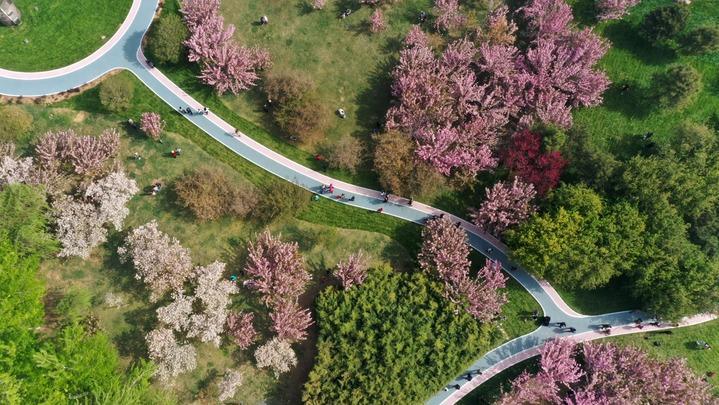 4月9日,游客在河北省石家莊市欒城區櫻花公園休閑游玩(無(wú)人機照片)。新華社記者 駱學(xué)峰 攝