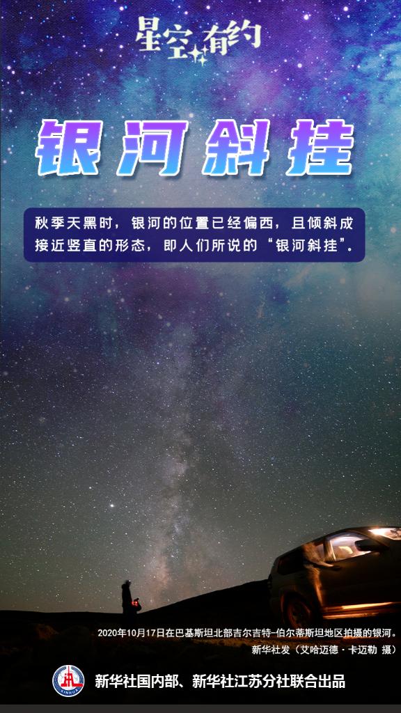 中國科學(xué)院紫金山天文臺科普主管王科超介紹,人們常用“飛馬當空,銀河斜掛”來(lái)概括秋季星空的特點(diǎn)。整個(gè)秋天,人們仍然能看到銀河懸掛在天空。不過(guò),銀河升起的時(shí)間較夏季變早。秋季天黑時(shí),銀河的位置已經(jīng)偏西,且傾斜成接近豎直的形態(tài),即人們所說(shuō)的“銀河斜掛”。