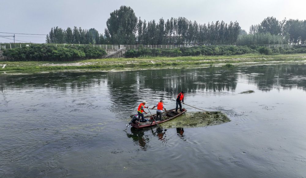 工作人員在引灤入津工程重要輸水河道河北省遵化市黎河打撈漂浮物(2023年9月11日攝,無(wú)人機照片)。新華社發(fā)(劉滿(mǎn)倉攝)