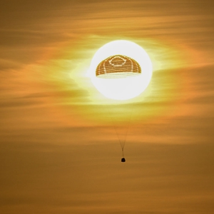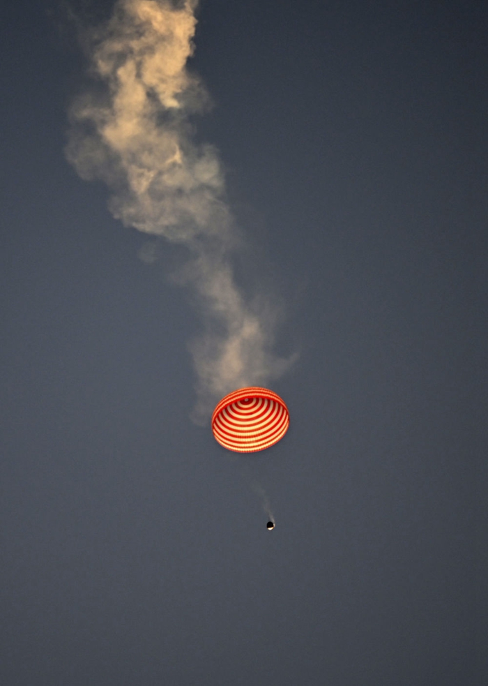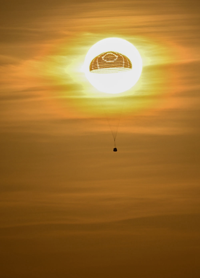 清晨,天已大亮?!班亍钡匾宦?,天空中傳來(lái)返回艙開(kāi)傘的聲音。