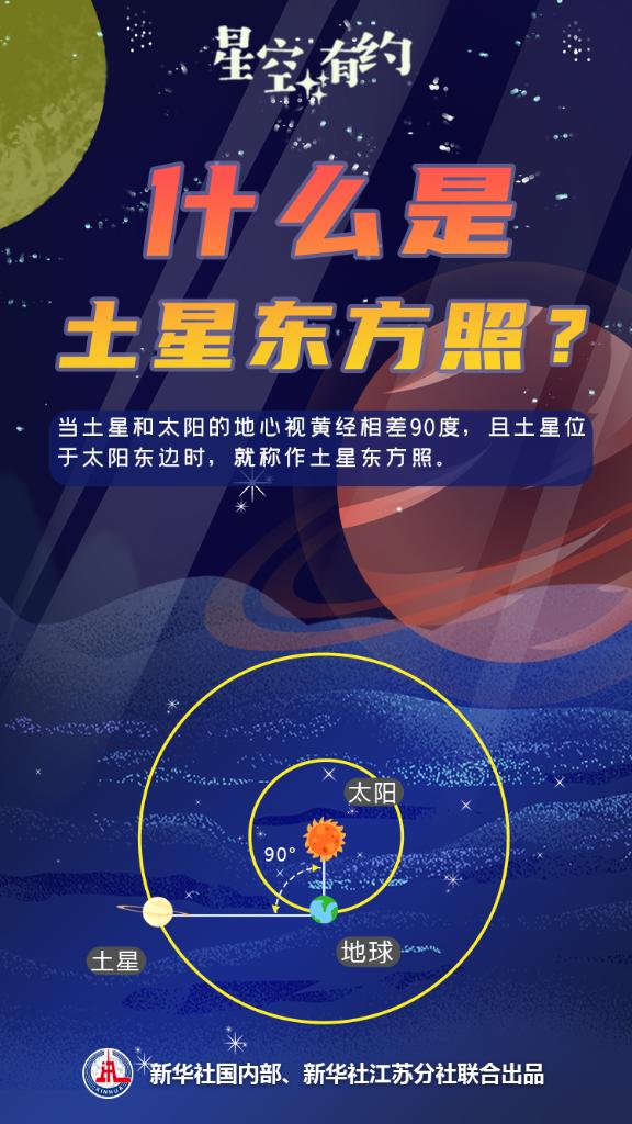 當土星和太陽(yáng)的地心視黃經(jīng)相差90度,且土星位于太陽(yáng)東邊時(shí),就稱(chēng)作土星東方照。如果可以俯視太陽(yáng)系的平面,此時(shí)你會(huì )看到太陽(yáng)、地球、土星形成了一個(gè)直角,地球處于直角的頂點(diǎn)。