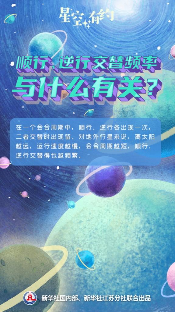 行星順行、逆行的發(fā)生頻率,取決于它們和地球的會(huì )合周期?!巴ㄋ椎刂v,地球和地外行星都在圍繞太陽(yáng)‘跑圈’。地球比地外行星多‘跑’一圈,再次‘追上’地外行星的時(shí)間就是會(huì )合周期?!堋迷铰男行?,地球越容易‘追’上,會(huì )合周期越短?!蓖蹩瞥f(shuō)。