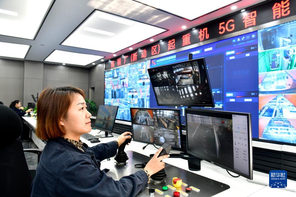 12月4日,工作人員在山鋼股份萊蕪分公司煉鋼廠(chǎng)起重機5G智能管控中心遙控操作吊運廢鋼。新華社記者 郭緒雷 攝