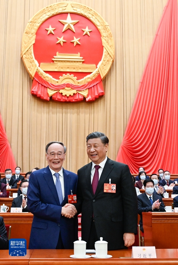 3月10日,十四屆全國人大一次會(huì )議在北京人民大會(huì )堂舉行第三次全體會(huì )議。習近平全票當選中華人民共和國主席、中華人民共和國中央軍事委員會(huì )主席。這是習近平同王岐山握手。