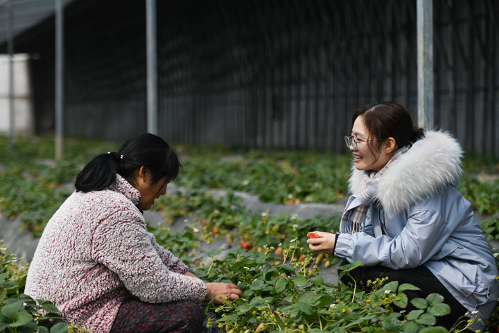 2月22日,在安徽省滁州市定遠縣吳圩鎮,王萌萌(右)與草莓種植戶(hù)交流。新華社記者 張端 攝
