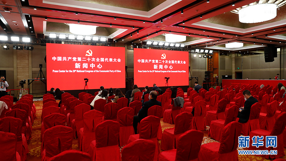 10月17日(星期一)10:00,二十大新聞中心將在梅地亞新聞中心二層新聞發(fā)布廳舉辦第一場(chǎng)記者招待會(huì )。圖為記者招待會(huì )前新世紀日航飯店三層世紀廳分會(huì )場(chǎng)。(新華網(wǎng) 陳杰 攝)