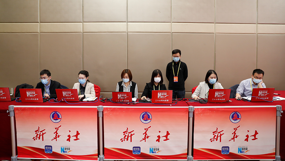 10月17日(星期一)10:00,二十大新聞中心將在梅地亞新聞中心二層新聞發(fā)布廳舉辦第一場(chǎng)記者招待會(huì )。圖為記者在分會(huì )場(chǎng)工作。(新華網(wǎng) 陳杰 攝)