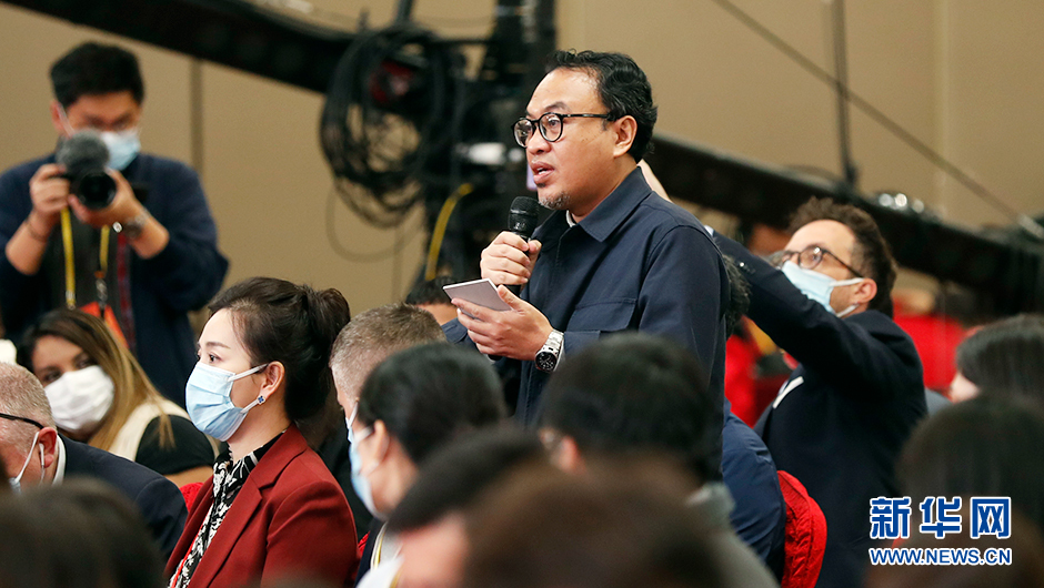 10月20日(星期四)10:00,二十大新聞中心在梅地亞新聞中心二層新聞發(fā)布廳舉辦第四場(chǎng)記者招待會(huì )。圖為印度尼西亞安塔拉通訊社記者在分會(huì )場(chǎng)提問(wèn)。(新華網(wǎng) 陳杰 攝)
