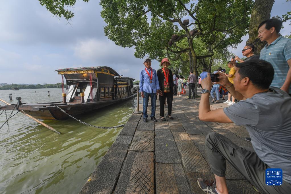 老黨員在浙江嘉興南湖湖心島停泊的南湖紅船旁留影(2021年7月1日攝)。新華社記者 徐昱 攝