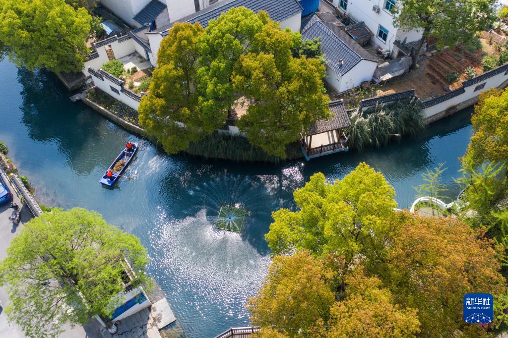 浙江省長(cháng)興縣龍山街道渚山村,保潔人員進(jìn)行日常河道護理巡查(2020年4月9日攝,無(wú)人機照片)。新華社記者 徐昱 攝