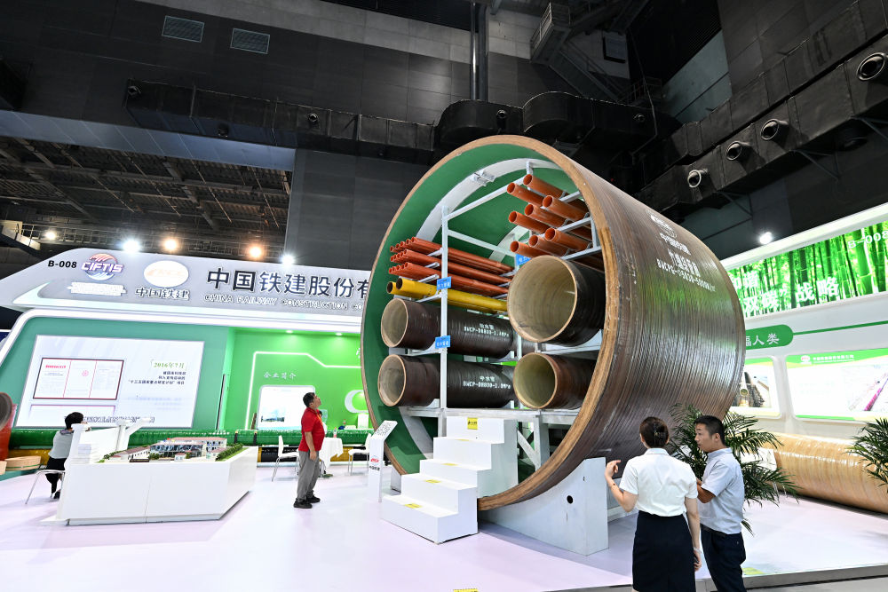 9月2日,在國家體育館舉行的服貿會(huì )環(huán)境服務(wù)專(zhuān)題展上,客商在中國鐵建展位竹纏繞管廊旁了解信息。新華社記者 李鑫 攝