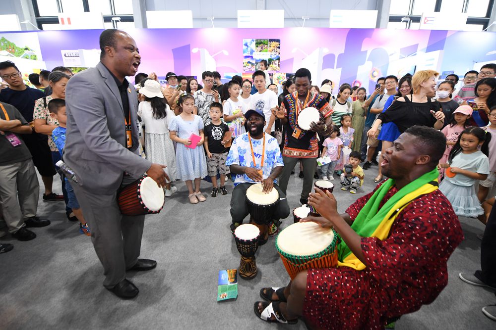 9月2日,在“一帶一路”沿線(xiàn)國家特色文化展示活動(dòng)上,加納共和國駐華大使館展區的工作人員在現場(chǎng)即興表演。新華社記者 鞠煥宗 攝
