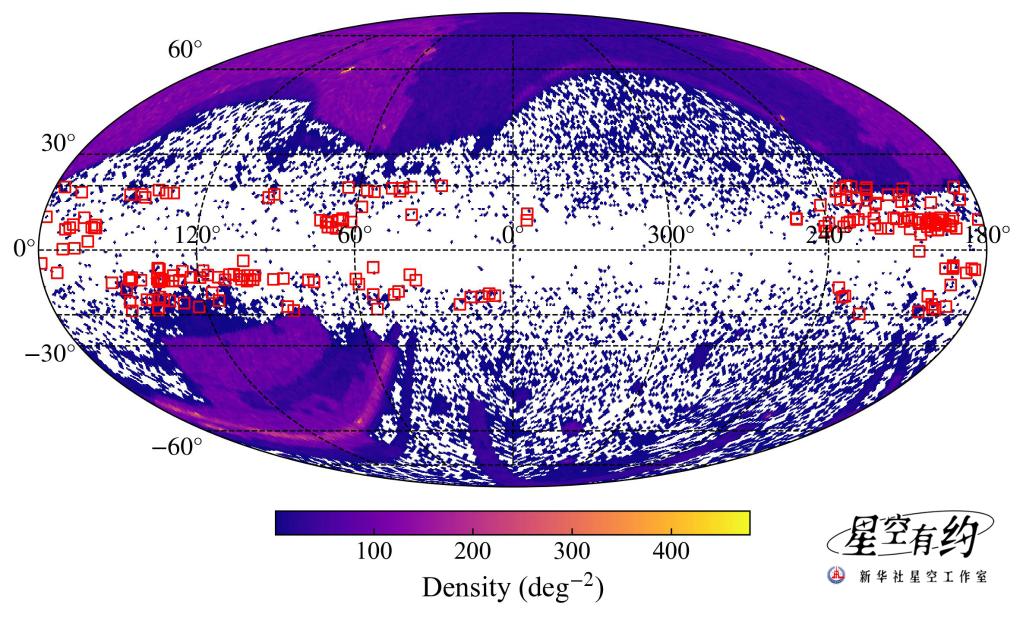 圖為類(lèi)星體在銀道坐標系中的分布,紅色方框代表此次通過(guò)光譜觀(guān)測發(fā)現的204個(gè)銀道面背景類(lèi)星體。(由受訪(fǎng)者提供)