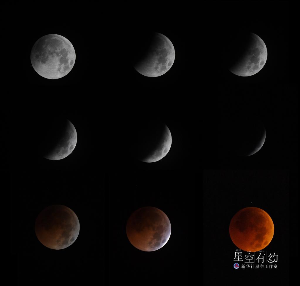 這是2018年7月28日在貴州省仁懷市拍攝的月全食過(guò)程(拼版照片)。新華社發(fā)(陳勇 攝)