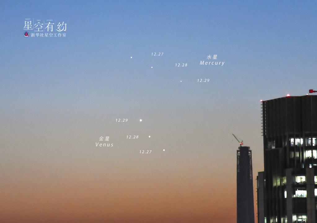 2022年12月21日水星東大距,天津市天文攝影愛(ài)好者楊婧在大距之后的12月27日至29日在天津市南開(kāi)區拍攝的水星金星相伴軌跡圖。(本人供圖)