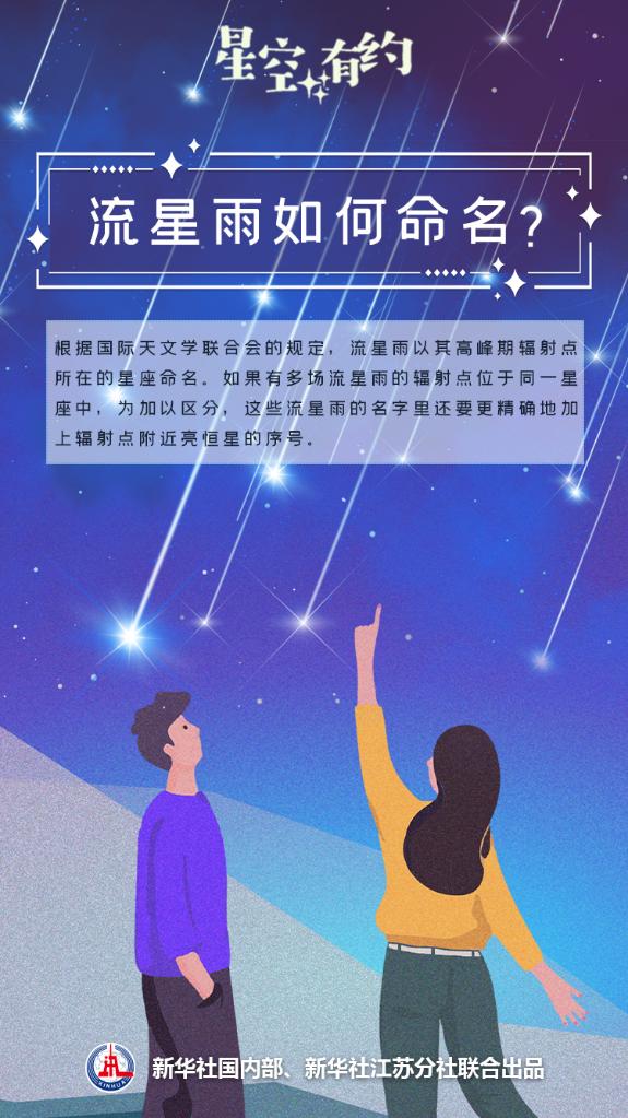 王科超解釋說(shuō),依照人們的肉眼觀(guān)察,同一場(chǎng)流星雨的流星看起來(lái)是從天球上的一個(gè)點(diǎn)發(fā)散出來(lái)的,這個(gè)點(diǎn)在天文學(xué)上稱(chēng)為輻射點(diǎn)。根據國際天文學(xué)聯(lián)合會(huì )的規定,流星雨以其高峰期輻射點(diǎn)所在的星座命名。據此規定,寶瓶座η流星雨高峰期的輻射點(diǎn)在寶瓶座內,所以被冠以寶瓶座之名。而如果有多場(chǎng)流星雨的輻射點(diǎn)位于同一星座中,為加以區分,這些流星雨的名字里還要更精確地加上輻射點(diǎn)附近亮恒星的序號,比如α、η等。兩個(gè)要素結合在一起,構成了流星雨的“怪名字”。