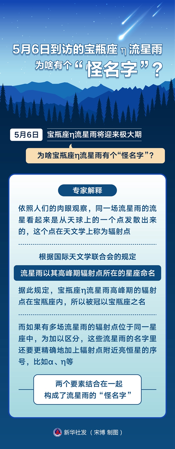 中科院紫金山天文臺科普主管王科超介紹,寶瓶座η流星雨的“怪名字”在“流星雨圈”中并不是獨一份。細心的公眾可能發(fā)現,7月底將迎來(lái)極大期的摩羯座α流星雨等,也有類(lèi)似的“怪名字”。這些名字與流星雨所處的方位有關(guān)。