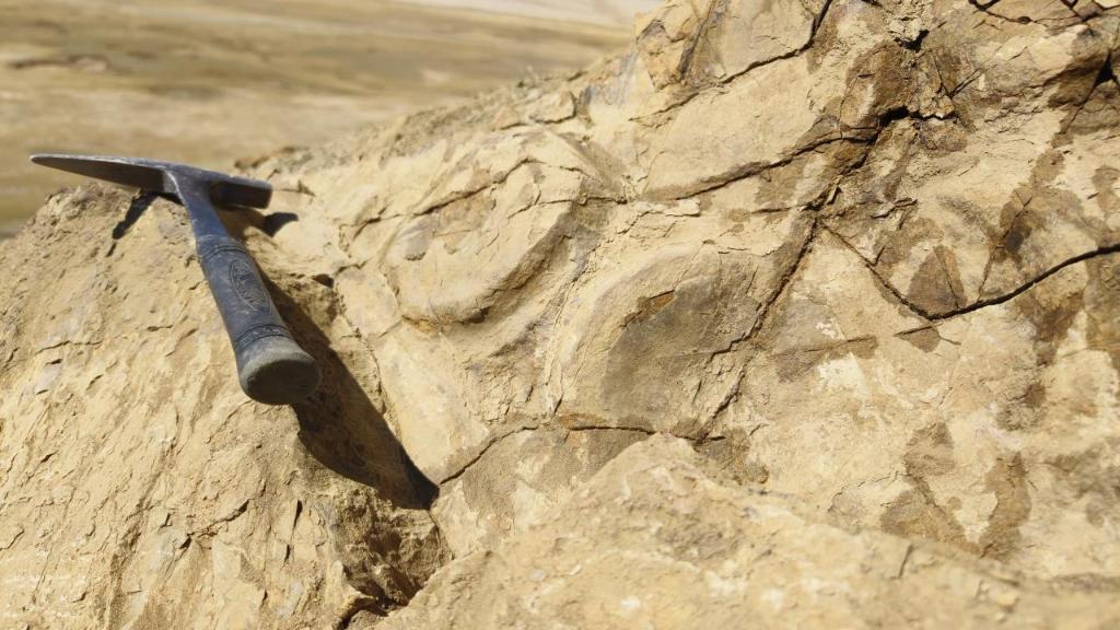 西藏定日地區三疊紀曲龍共巴組巖層中的魚(yú)龍化石錐體(圓盤(pán)狀物體)和肋骨。(中國科學(xué)院古脊椎動(dòng)物與古人類(lèi)研究所供圖)