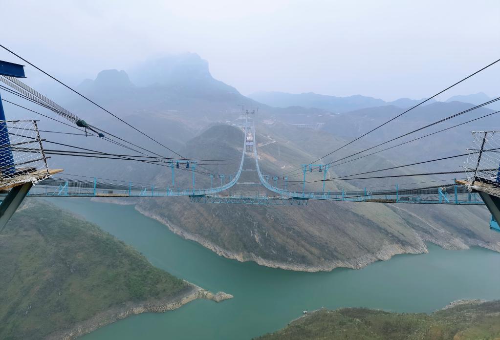 在施工現場(chǎng),記者乘坐近十分鐘電梯登上相當于88層樓高的晴隆岸主塔。細雨隨風(fēng)襲來(lái),山水相映成畫(huà)。兩條分別長(cháng)達1900多米的“貓道”,懸掛在距離地面200多米的高空中,在牂牁江兩岸架起跨江“天道”。行走在這個(gè)由鋼絲網(wǎng)和木條組成的施工通道上,現場(chǎng)的施工人員已經(jīng)習以為常,他們每天都要來(lái)回穿梭,一趟就得近三個(gè)小時(shí)。