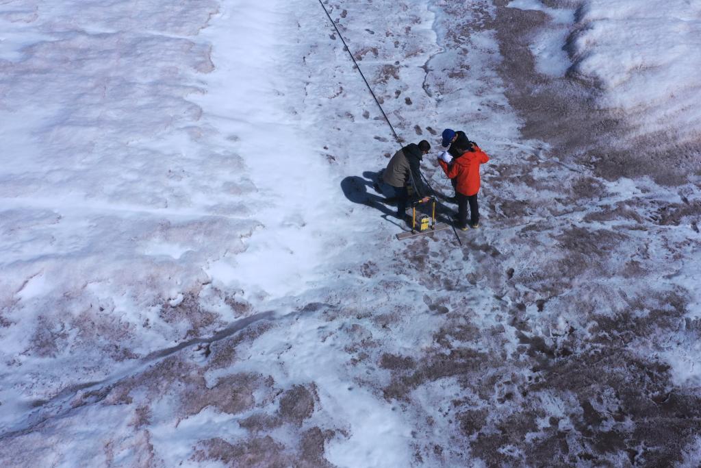 7月27日,范越(左一)和董士琦(左二)在長(cháng)江源區的冬克瑪底冰川上使用地質(zhì)雷達探測冰川厚度(無(wú)人機照片)。新華社記者 陳杰 攝