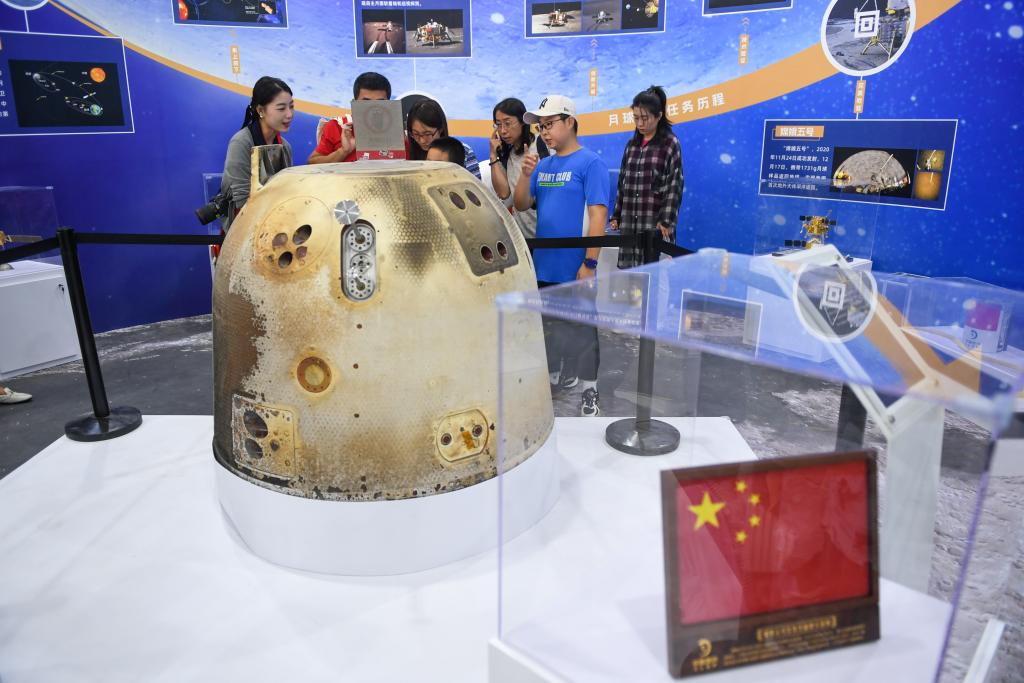9月17日,在全國科普日北京主場(chǎng)活動(dòng)展區,參觀(guān)者參觀(guān)展出的嫦娥五號再入返回飛行試驗任務(wù)返回器。新華社記者鞠煥宗 攝