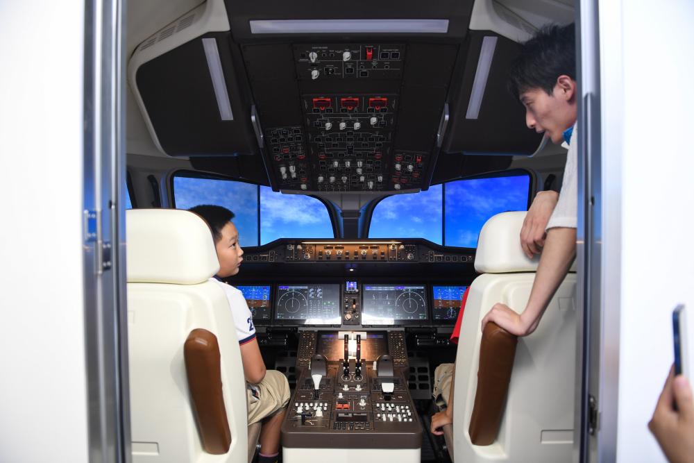 9月17日,在全國科普日北京主場(chǎng)活動(dòng)展區,兩名小朋友在體驗C919模擬駕駛器。新華社記者鞠煥宗 攝