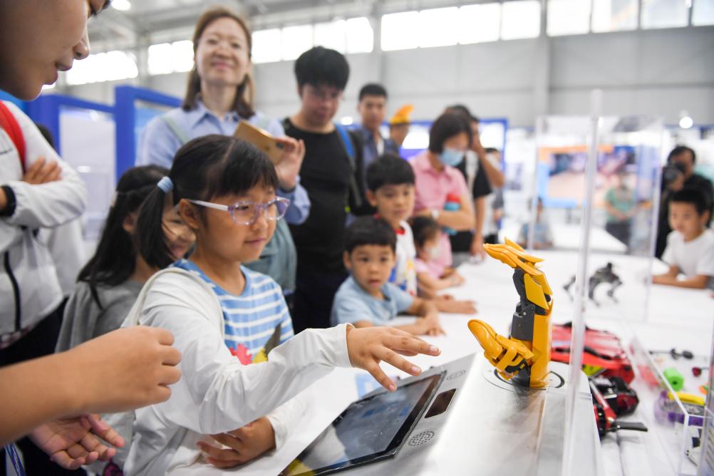 9月17日,在全國科普日北京主場(chǎng)活動(dòng)展區,小朋友體驗與一款機器手進(jìn)行動(dòng)作同步。新華社記者鞠煥宗 攝